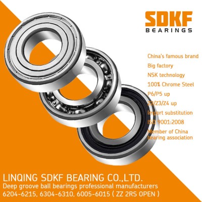 1. SDKF deep groove ball bearings are the most representative and widely used bearing. In addition to radial loads, it can accommodate axial loads in both directions, even at high speeds. They are available for low noise and low vibration. Bearings with metal shields and rubber seals are pre-lubricated by some grease. Bearings with snap rings are designed to fit into a groove in the out track of the bearings, and flanged bearings are designed to aid the mounting and positioning of a bearing in a delicate application. Deep groove ball bearings with filling slots have the same dimensions with standard ones. Filling slot bearings have a higher radial load carrying capacity than bearings without filling slots.